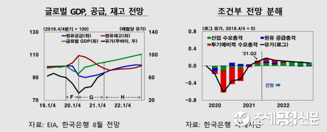 한은은 보고서에서 "다만 변이 바이러스 확산, 달러화 강세 등 유가 하방 요인과 생산 차질 회복 지연, 이상 한파 가능성 등 유가 상방 요인이 있는 만큼 향후 유가 흐름에 대한 불확실성은 여전히 크다"고 진단했다.