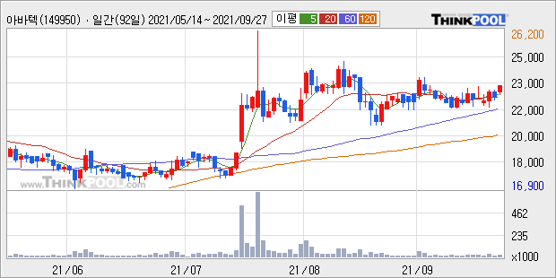 아바텍의 2020년 매출액은 전년대비 0.4% 늘어난 757억원이고, 영업이익은 전년대비 -31.9% 줄어든 37억원을 기록했다. 이 회사의 매출액 증감률과 영업이익 증감률은 각각 코스닥 상위 50%, 하위 36%에 해당된다.