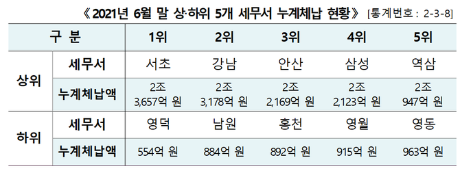 세무서별로는 서초세무서가 2조3657억원으로 가장 많았고 영덕세무서는 554억원으로 최하위를 기록했다.