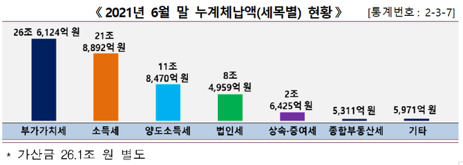 세목별로는 부가가치세 26조6124억원(36.6%), 소득세 21조8892억원(30.1%), 양도소득세 11조8470억원(16.3%), 법인세 8조4959억원(11.7%) 순으로 나타났다.