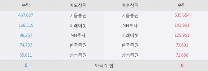 아직까지 외국계 증권사 창구를 통한 매매는 발생하지 않고 있다. 그리고 이 시간 NH투자가 매수창구상위에 올라있는 종목은 이 종목 이외에도 삼부토건, KBSTAR 200철강소재 등이 있다.