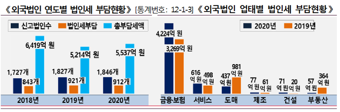 29일 공개된 2021 국세통계 3차 수시공개에 따르면, 지난해 법인세를 신고한 외국법인 수는 1846개에 달했다.