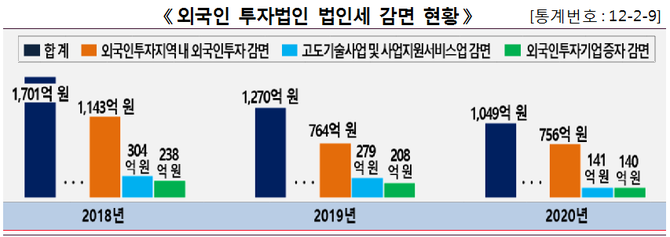 외국인 투자법인 감면액은 2018년 1701억원에서 2019년 1270억원, 2020년 1049억원으로 전반적으로 크게 감소추세를 기록했다.