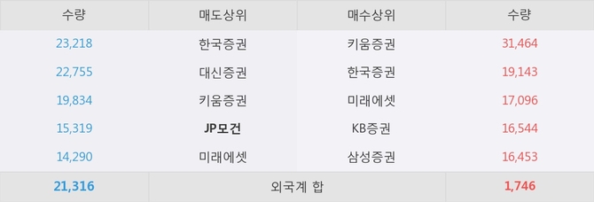 거래원 동향은 JP모건, 미래에셋이 매도 상위 목록에 나타나고 있다.