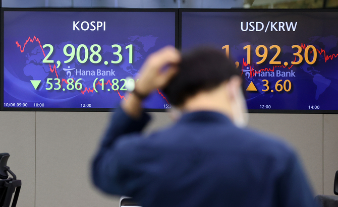 6일 코스피는 전날보다 53.86포인트(1.82%) 급락한 2,908.31에 마감하며 연중 최저치를 경신했다. 지수가 사흘 연속 급락하며 작년 연말 수준으로 되돌아갔다.