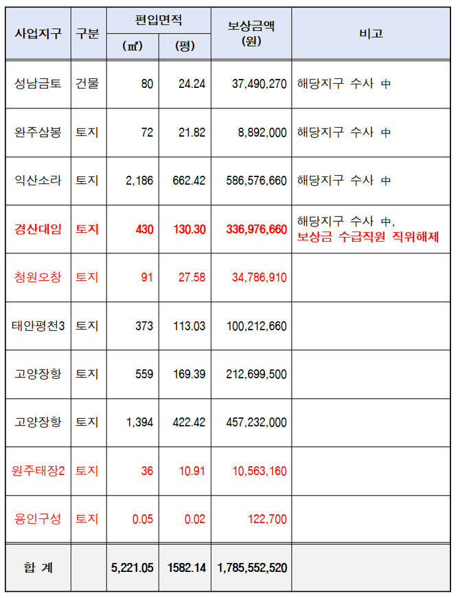 하지만 LH는 최근 10년간 임직원 소유 토지(9명) 및 건물(1명)에 총 17억8555만원을 보상했는데, 이 중 경산 대임지구 430㎡에 3억3700만원을 보상받은 직원이 관련 혐의로 직위 해제된 상태다.