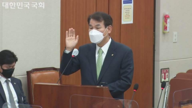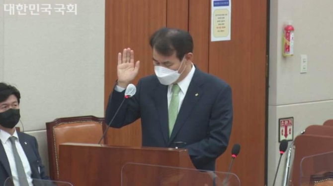 사진은 정 원장이 정무위 국감에서 증인선서를 하고 있는 모습.