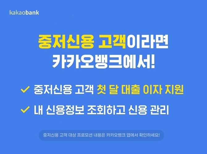 11일 카뱅에 따르면 연말까지 '중신용대출', '중신용플러스대출', '중신용비상금대출' 등을 신규로 받은 중저신용 고객(코리아크레딧뷰로 기준 820점 이하)에게 첫 달 이자를 지원한다. 이자는 고객 본인 명의의 카뱅 계좌로 지급되며, 별도로 응모하지 않아도 된다.