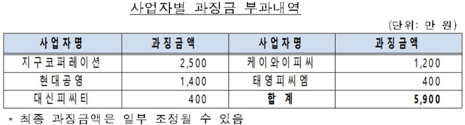 공정거래위원회는 11일 콘크리트 하수관의 공공 구매 입찰에서 담합한 경기 파주 소재 지구코퍼레이션, 현대공영, 대신피씨티, 케이와이피씨, 태영피씨엠 5개사에 시정명령과 과징금 총 5천900만원을 부과하기로 했다고 밝혔다.