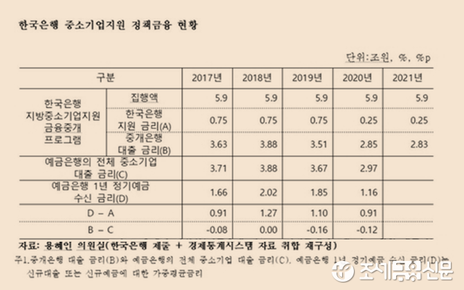 14일 국회 기획재정위원회 소속 용혜인 의원(기본소득당)이 한은 자료와 경제통계시스템 데이터를 분석한 결과, 한은으로부터 연리 0.75%로 매년 5조9천억원을 대여받은 은행들이 지방 중소기업에 대출할 때 적용한 평균 금리는 2017년 3.63%, 2018년 3.88%, 2019년 3.51%였다.
