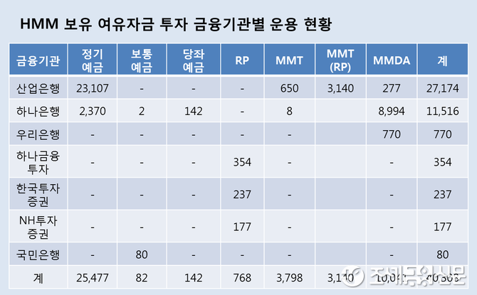 산은을 포함한 전 금융사를 기준으로 보면 HMM의 전체 여유자금 중 63.2%(2조5천477억원)가 정기예금에 쏠려 있으며, MMDA와 MMT(RP)가 각각 24.9%(1조41억원)와 7.8%(3천140억원)를 차지했다. 그밖에 당좌예금과 보통예금 등이 나머지 4.1%를 구성했다.