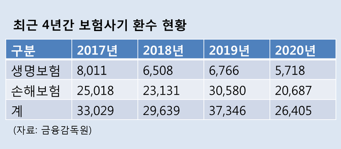 보험사기는 꾸준히 증가하고 있지만, 보험사기 적발 후 환수금액은 4년간 1천264억원으로 적발액의 3.8%에 그쳤다. 지난 4년간 연간 환수금액은 264억∼370억원에 머물렀다.