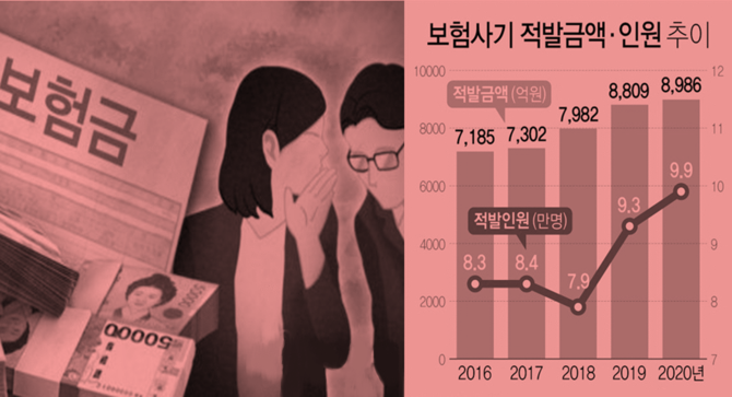 보험사기로 적발된 인원은 증가 추세다. 2019년 9만2천538명, 2020년 9만8천826명으로 늘어나 10만명에 가까워졌다.