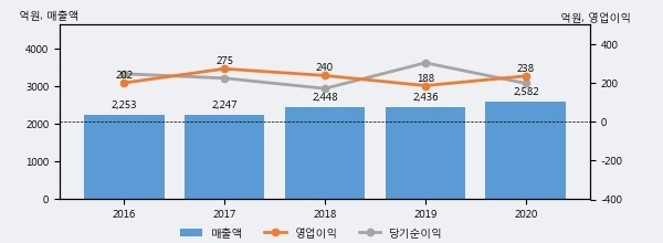 최근 실적을 살펴보면 2020년 매출액이 최근 5년 중 가장 높은 실적을 기록했음을 알 수 있다. 이전 최고 실적이었던 2018년 보다도 5.5%(134억 1천만원) 늘어난 것으로 나타났다.