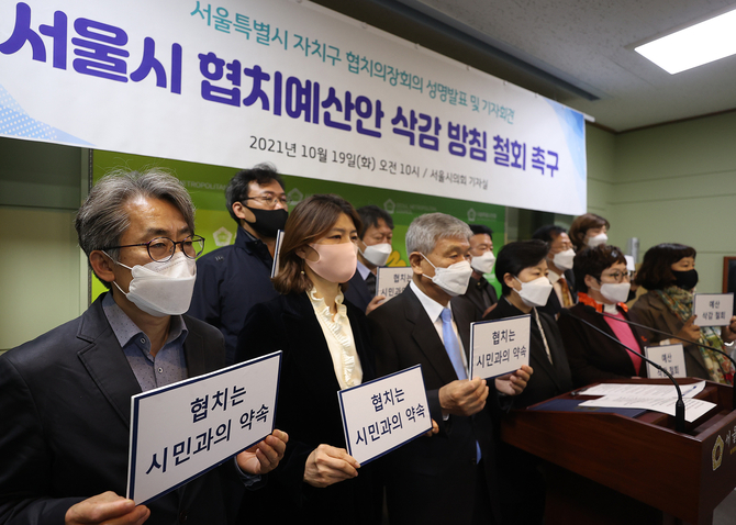 해당 자치구 구청장 등이 속한 이 단체는 "서울시가 내년도 시민참여형 예산을 70∼80% 삭감하는 방침을 세우고 예산을 조정 중"이라며 "예산 대폭 삭감은 서울시 스스로가 만든 '시민참여예산' 제도를 무색하게 하고 서울시민과 자치구와의 신뢰를 저버리는 행위"라고 주장했다.