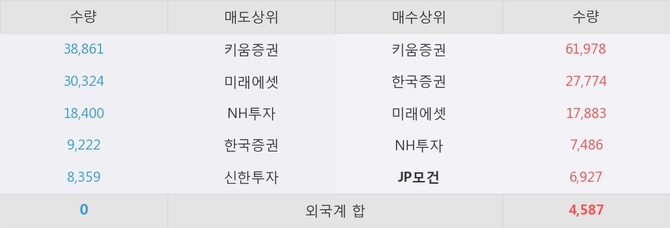 거래원 동향은 JP모건, 미래에셋, NH투자 등이 매수 상위 목록에 나타나고 있다.