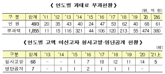 2011년 해외금융계좌 첫 신고를 실시한 이후 올해 6월말까지 과태료 처분을 받은 미신고자 493명으로 과태료는 1855억원에 달했다.