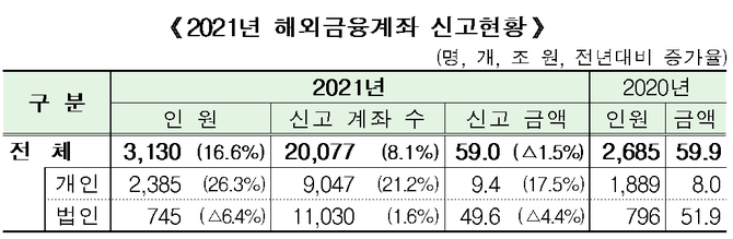 또한, 해외 주식 투자자들이 늘어나면서 주식계좌 신고인원이 증가했다.