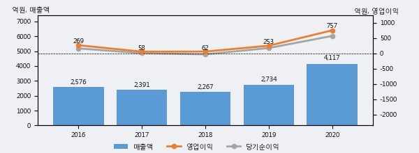 최근 실적을 살펴보면 2020년 매출액이 최근 5년 중 가장 높은 실적을 기록했음을 알 수 있다. 이전 최고 실적이었던 2019년 보다도 50.6%(1382억 7천만원) 늘어난 것으로 나타났다.