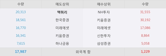 거래원 동향은 맥쿼리, 미래에셋, 하나금융 등이 매도 상위 목록에 나타나고 있다.