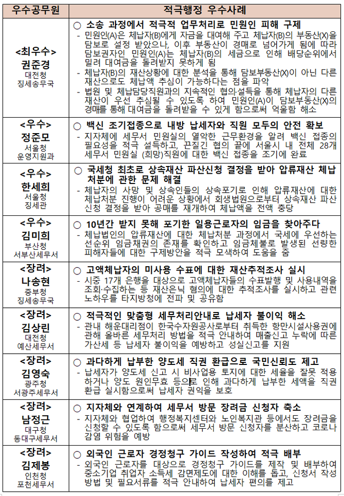 이밖에 장려상에 중부지방국세청 나송현 조사관, 예산세무서 김상린 조사관, 서광주세무서 김영숙 조사관, 동대구세무서 남정근 조사관, 포천세무서 김제봉 조사관 등이 수상명단에 올랐다.