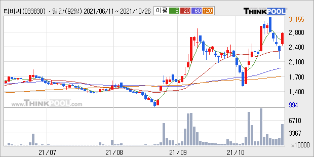 일봉 차트의 모습은 현재 단기·중기 이평선이 정배열 상태로 전형적인 상승세를 보이고 있다. 이 종목의 차트에서 최근에 주가 5MA 상향돌파 등을 확인할 수 있다