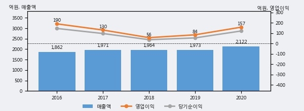최근 실적을 살펴보면 2020년 매출액이 최근 5년 중 가장 높은 실적을 기록했음을 알 수 있다. 이전 최고 실적이었던 2019년 보다도 7.6%(149억 4천만원) 늘어난 것으로 나타났다.