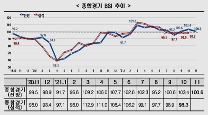 전국경제인연합회 산하 한국경제연구원은 29일 매출액 기준 600대 기업을 대상으로 실시한 기업경기실사지수(Business Survey Index·BSI) 조사 결과 11월 전망치가 전월(103.4) 대비 2.8포인트 하락한 100.6을 기록했다고 발표했다.
