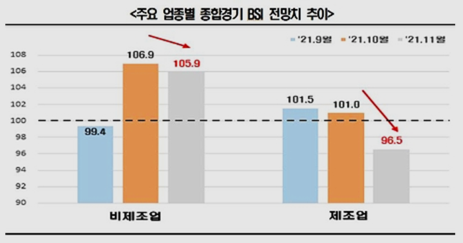 산업별로 제조업 중 목재·가구·종이(69.2), 석유정제·화학(83.9) 등 해외 원자재와 에너지 의존도가 높은 업종의 경기 전망이 부정적인 것으로 나타났고, 비제조업의 경우 백신 접종률 제고와 '위드 코로나' 전환, 유류세 인하 등으로 내수 활성화와 가계 소비 확대 기대감이 커져 긍정적 전망이 우세했다.