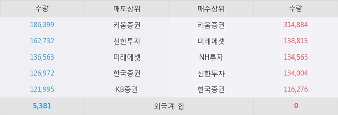 이 시각 주요 거래원은 미래에셋, 키움증권, 신한투자 등이 매도 상위 창구에 자리하고 있다.