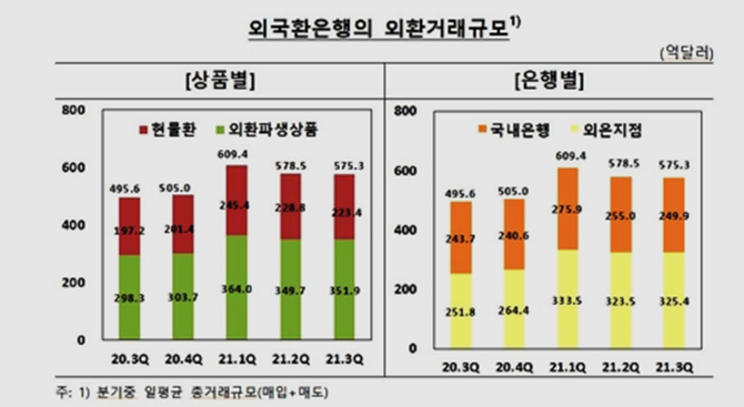 외국환은행 가운데 국내은행의 외환거래액(249억9천만달러)은 2%(5억1천만달러) 감소했다. 반면 외국은행 지점의 외환거래액(325억4천만달러)은 0.6%(1억9천만달러) 늘었다.