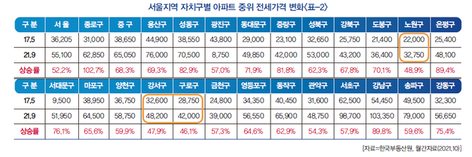 그나마 가격은 많이 올랐지만 전세가격이 적게 오른 지역이 구로구로 46.1% 상승했으며 강서구가 최근 아파트 매매가격이 급상승하고 있으나 전세가격은 아직 다른 지역보다 적어 47.9% 상승했다. 노원구도 47.9% 상승하여 맴가격은 상승하였으나 전세가격은 적게 오른 편이다.