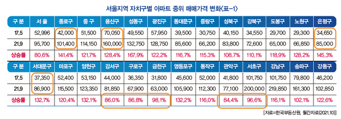 또 문재인 정부 취임 이후 지난 2017년 5월부터 지난 9월 말까지 한국부동산원의 자료를 인용하여 서울지역 자치구별 아파트 중위 매매가격 변화를 시계열 분석해 보면 <표-1>에서 보는 바와 같이 서울에서 아파트 가격이 가장 많이 상승한 지역은 서초·강남·송파가 아니고 성동구로 무려 167.9%나 상승하였다. 두 번째는 은평구로 145.3%, 세 번째는 종로구로 141.4%이며 네 번째 역시 서대문구로 132.7%나 상승을 했다.