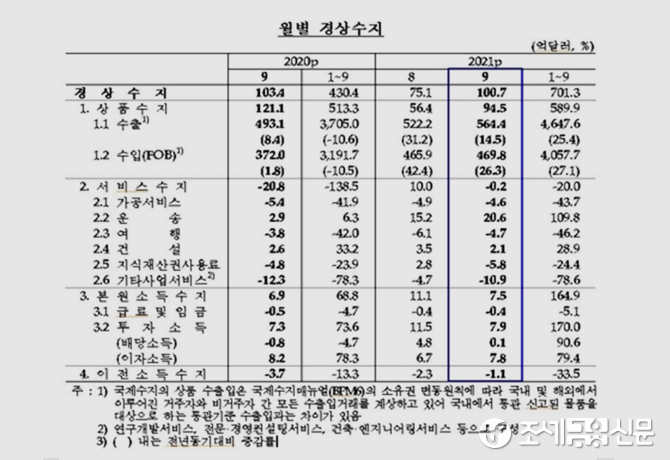 9월 선박 컨테이너운임지수(SCFI)와 항공화물운임지수(TAC·상하이-미국)가 전년 동월대비 각 230.2%, 135.7% 급등하면서 운송수입(46억3천만달러)이 사상 최대로 불었기 때문이다. 하지만 여행수지 적자 규모(-4억7천만달러)는 작년 9월(-3억8천만달러)보다 더 커졌다.