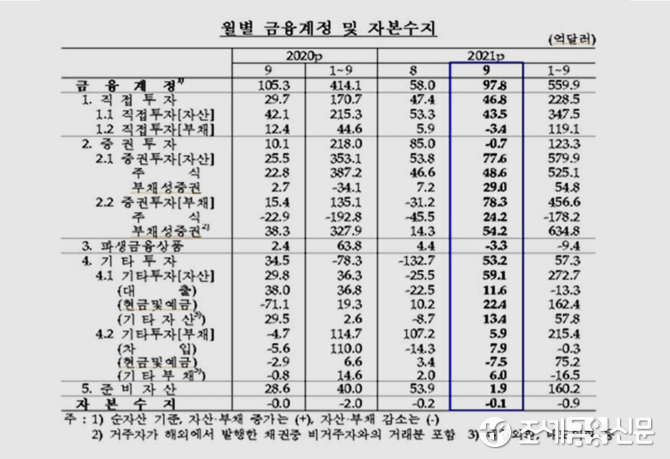 금융계정 순자산(자산-부채)은 9월 중 97억8천만달러 늘었다. 직접투자의 경우 내국인의 해외투자가 43억5천만달러 증가했지만, 외국인의 국내투자는 3억4천만달러 줄었다. 증권투자에서는 내국인 해외투자가 77억6천만달러, 외국인의 국내 증권투자도 78억3천만달러 늘어났다.