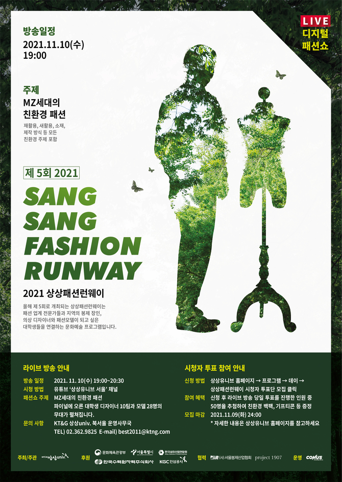 올해는 ‘MZ세대의 친환경 패션’을 주제로, ‘KT&G 상상유니브’가 주관하고 문화체육관광부와 서울특별시 등이 후원한다. 지난 7월 KT&G 상상유니브는 디자인과 모델 2개 분야에서 대학생 참가자를 모집했다.