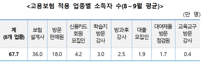 올해 7월부터 고용보험이 새로 적용되는 8개 업종 종사자 중 소득자료가 제출된 인원은 평균 68만명이며, 보험설계사(36만명), 방문판매원(18만명) 순으로 많았다.