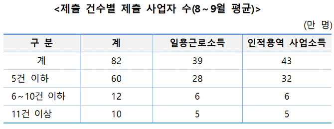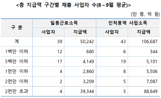 소득자료를 제출한 82만명의 사업자 중 54만명(일용근로 29만명, 인적용역 25만명)이 지급한 월 평균 소득은 500만원 이하인 것으로 나타났다.