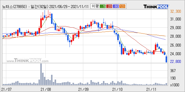 노터스의 2020년 매출액은 전년대비 27.1% 늘어난 585억원이고, 영업이익 또한 전년대비 31.4% 늘어난 88억원을 기록했다. 이 회사의 매출액 증감률과 영업이익 증감률은 각각 코스닥 상위 17%, 상위 35%에 해당된다.