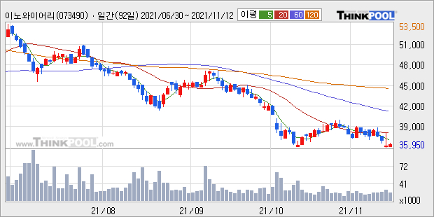 이노와이어리스의 2020년 매출액은 930억으로 전년대비 -4.0% 하락했고, 영업이익 역시 138억으로 전년대비 -10.1% 하락했다. 이 회사의 매출액 증감률과 영업이익 증감률은 각각 코스닥 하위 41%, 하위 45%에 해당된다.