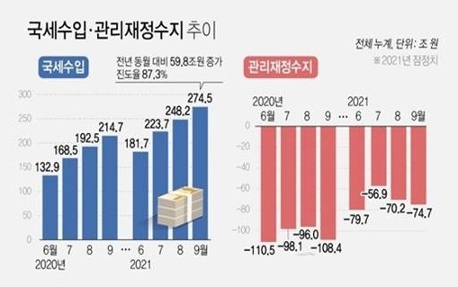 (조세금융신문=김종태 기자) 올해 9월까지 국세수입이 작년 대비 60조원 가까이 늘었지만 나라 살림 적자는 75조원에 육박했고, 국가채무도 증가세를 이어갔다.