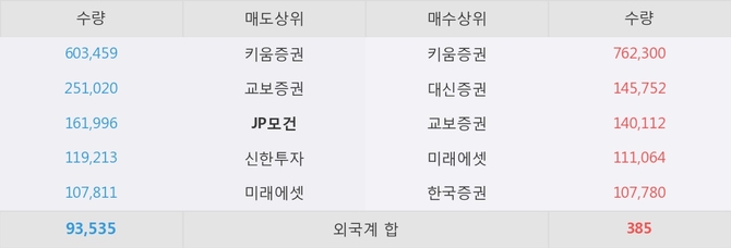이 시각 주요 거래원은 미래에셋, 키움증권, 대신증권 등이 매수 상위 창구에 자리하고 있다. 한편, 매도 창구 상위에는 JP모건이 눈에 띄고 있다.