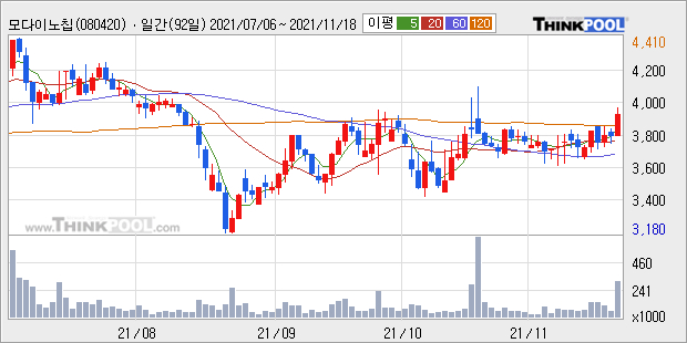 모다이노칩의 2020년 매출액은 전년대비 28.8% 늘어난 4122억원이고, 영업이익은 전년대비 -15.1% 줄어든 259억원을 기록했다. 이 회사의 매출액 증감률과 영업이익 증감률은 각각 코스닥 상위 17%, 하위 43%에 해당된다.