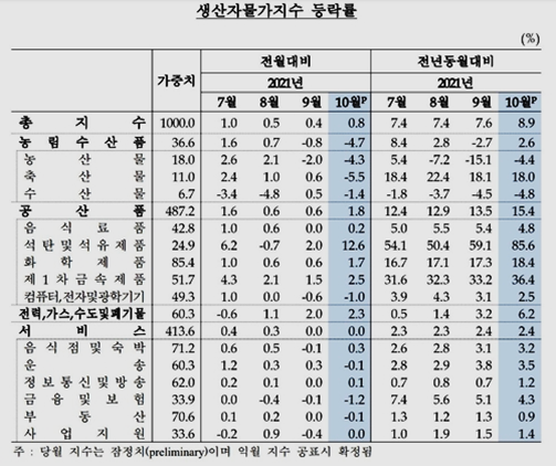 19일 한국은행에 따르면 10월 생산자물가지수(잠정)는 9월보다 0.8% 높은 112.21(2015년 수준 100)로 집계, 지난해 11월부터 1년째 올랐고, 지난 4월 이후 7개월 연속 최고치를 경신했다.