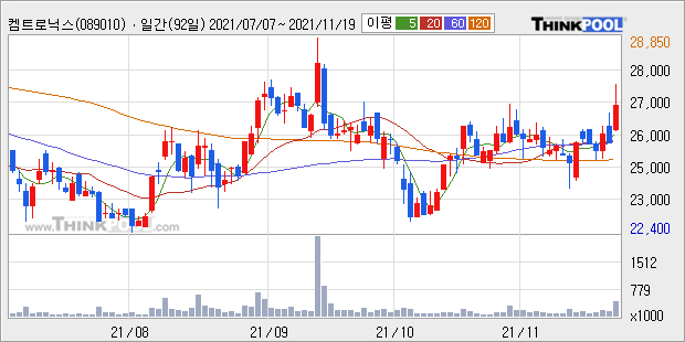 켐트로닉스의 2020년 매출액은 전년대비 31.4% 늘어난 5300억원이고, 영업이익은 전년대비 -16.1% 줄어든 221억원을 기록했다. 이 회사의 매출액 증감률과 영업이익 증감률은 각각 코스닥 상위 16%, 하위 42%에 해당된다.