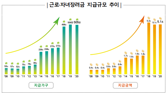 지급규모의 증가는 연령제한이 단계적으로 폐지되고 소득기준이 완화되는 등 지속적으로 제도가 확대된 결과다. 2015년에는 당초 근로장려금 지급대상에서 배제되었던 자영업자도 근로장려금을 지급받게 되었고 저소득 가구의 자녀양육을 지원하고자 자녀장려금도 최초로 지급되었다.