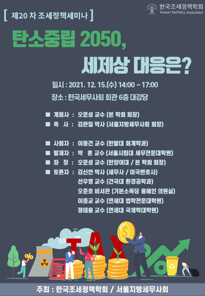 (조세금융신문=고승주 기자) 한국조세정책학회가 서울지방세무사회와 함께 12월 15일 오후 2시 한국세무사회 회관 6층 대강당에서 ‘탄소중립 2050, 세제상 대응은?’ 세미나를 개최한다.