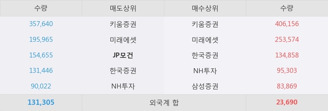 거래원 동향은 미래에셋, NH투자, 삼성증권 등이 매수 상위 목록에 나타나고 있다. 한편, 매도 창구 상위에는 JP모건이 눈에 띄고 있다.