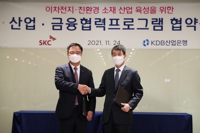 (조세금융신문=진민경 기자) 산업은행이 SKC의 자회사인 SK넥실리스의 전북 정읍 소재 동박 공장에서 SKC와 ‘이차전지·친환경 소재 육성을 위한 산업·금융협력프로그램’ 협약을 체결했다.
