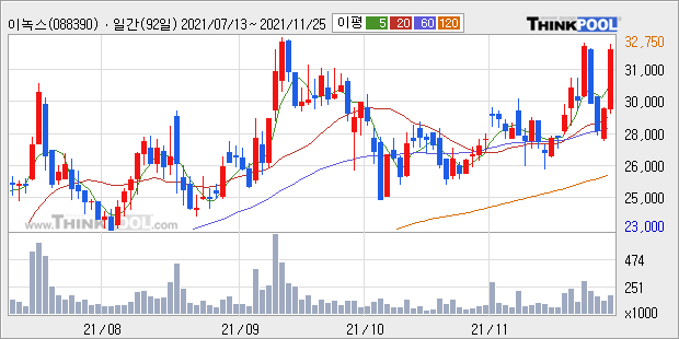 이녹스의 2020년 매출액은 544억으로 전년대비 30.9% 상승했고, 영업이익은 106억으로 흑자전환했다. 이 회사의 매출액 증감률과 영업이익 증감률은 각각 코스닥 상위 16%, 상위 6%에 해당된다.